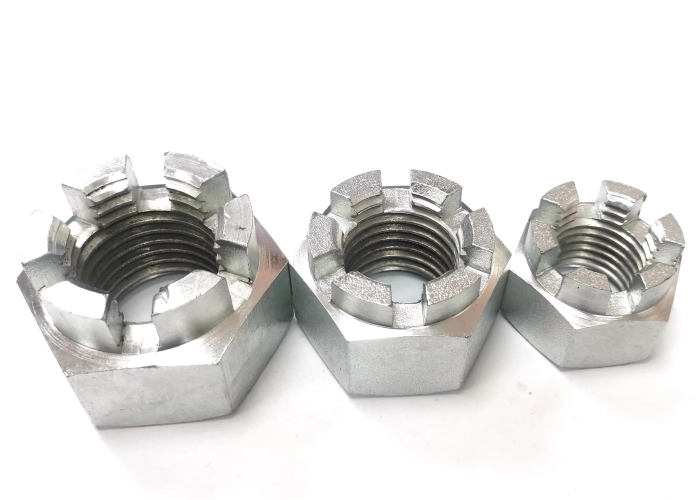 DIN 935 hexagon nuts with slots, also known as crown-type slotted nuts or round head slotted nuts, are hexagonal nuts with a slotted design. They are used in vehicle assemblies to secure front and rear axles by tightening through axle bolts, ensuring the chassis and tires are firmly connected.